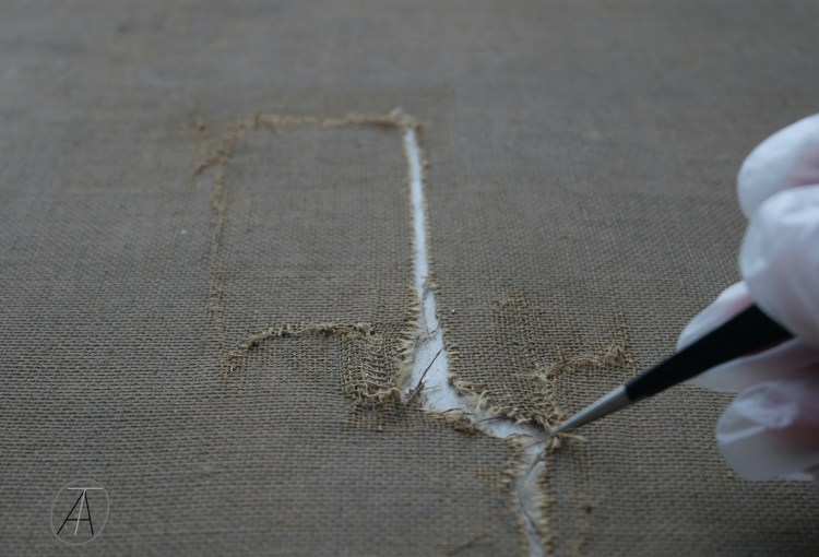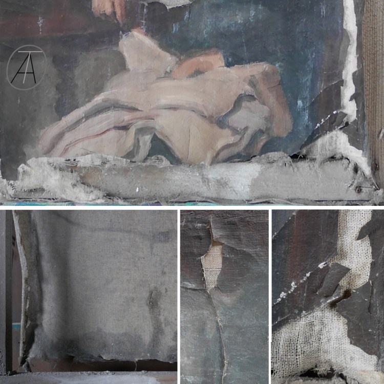 - Intervention support : Assainissement et nettoyage /Traitement des accidents (déchirures et lacunes)/Consolidation généralisée ou localisée du support (rentoilage, doublage, bandes de tension…etc) / Dérestauration d’anciennes interventions…