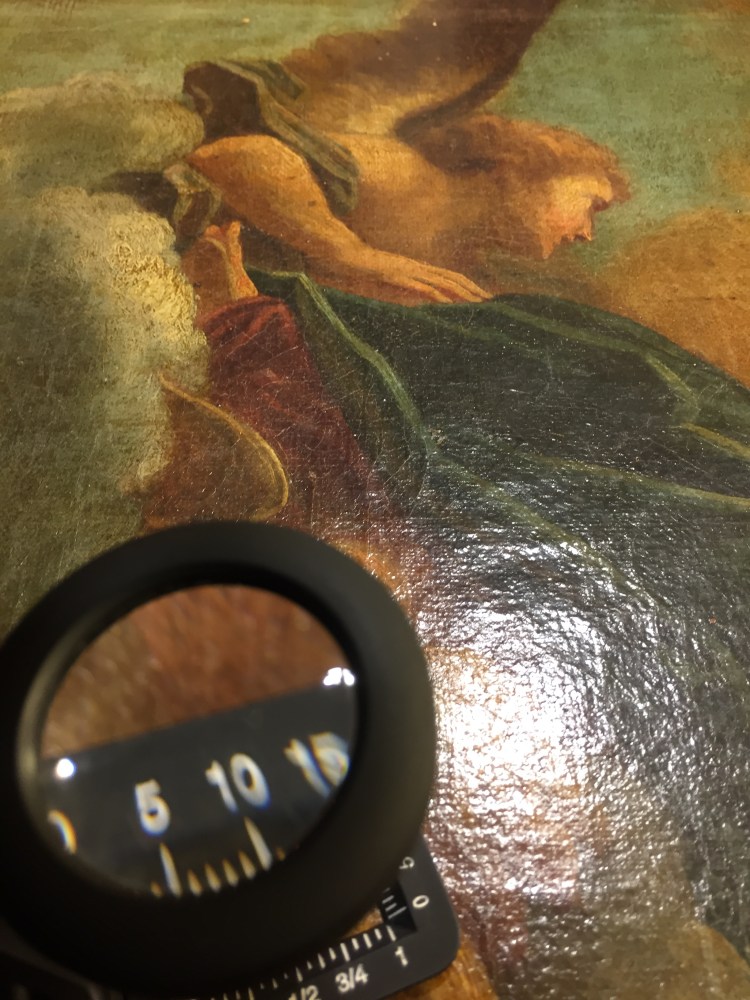 - Intervention couche picturale : Consolidation de la couche picturale /Nettoyage de surface/Dégagement de repeints anciens altérés/ Allègement de vernis altéré/Comblement des lacunes de matière picturale/Réintégration chromatique (retouches)/Pose de vernis protecteurs…